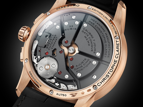 視覺之旅一直延續至錯綜複雜的機芯,機芯由位於12時位置的兩組串聯發條盒提供動力,確保最佳效益。於同一位置,錶橋以鏤空方式呈現,使第一個發條盒的彈簧片一覽無遺,佩戴者因而可以知道7日動力儲存的剩餘動力。CHRISTOPHE CLARET格睿時的金科玉律:糅合技術與美學以造就實際可用的複雜功能腕錶,Maestro堪稱品牌孜孜不倦追求完美的典範之作。