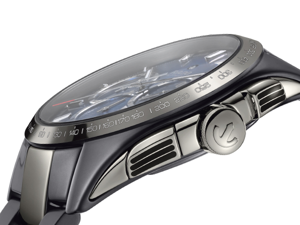 拋光錶圈上鐫刻有測速刻度,讓運動愛好者可透過測速刻度與帶有紅色針尖的秒針進行測速功能,可以以持續時間為基準測量速度或以速度為基準測量距離。錶款採用電漿高科技陶瓷材質打造,營造出獨特的暖色系金屬光澤,進化腕錶的精緻質感。