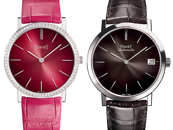 Altiplano 34毫米粉紅色錶盤 (G0A42100 及G0A42109)/Altiplano 40毫米暗灰色(G0A42050)、藍色 (G0A42051) 及松綠色(G0A42052) 錶盤在伯爵創新經典的設計深處,蘊藏色彩與光澤,周年系列自然將之融入其中。