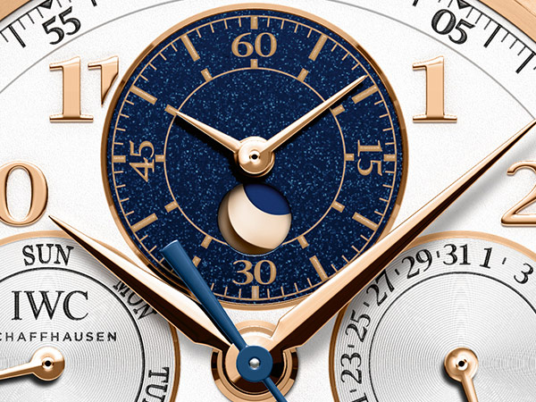 達文西萬年曆計時腕錶首度將計時時針與分針和月相盈虧顯示集成於小面盤中,為此IWC萬國錶的製錶大師重新打造了89630型自製機芯。鍍銀或鍍金小面盤演繹盈月生輝,與此同時,深藍色圓形顯示盤——即地球陰影——旋轉,逐漸呈現月相虧蝕。白金顆粒在深藍色背景映襯下熠熠生輝,令小面盤好似繁星密佈的夜空。