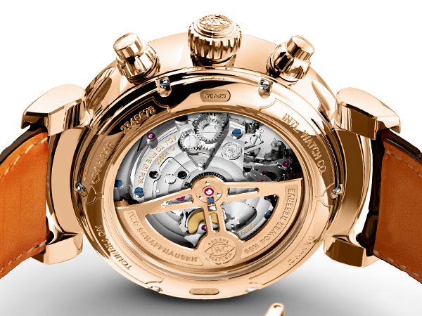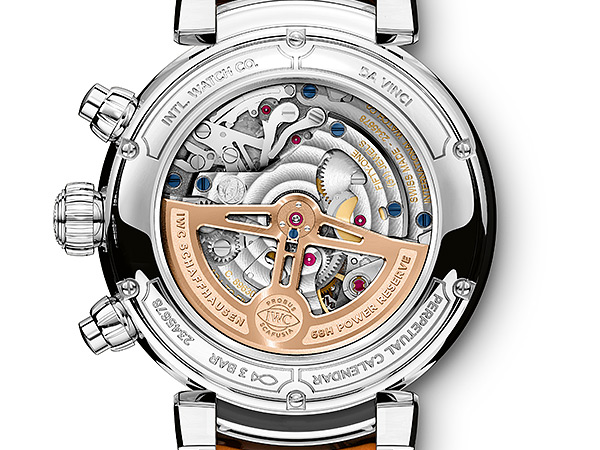 透過透明藍寶石玻璃錶底,佩戴者可欣賞嵌有藍鋼螺絲的複雜精妙的機芯設計、紅金自動盤以及橋板上的豐富飾紋。配備68小時動力儲備的89630 型自製計時機芯清晰可見,並由IWC 萬國錶雙棘爪自動上鍊系統為其提供能量。