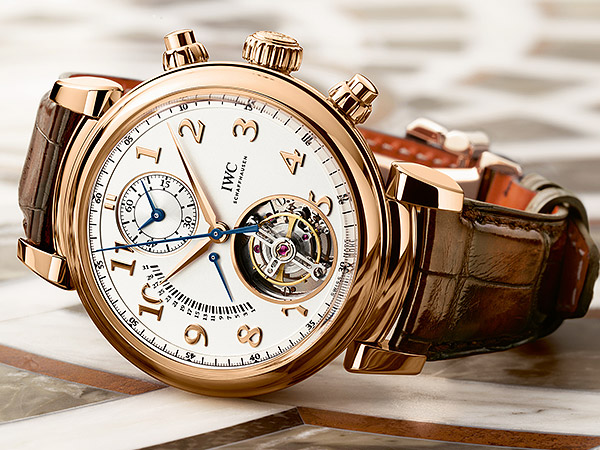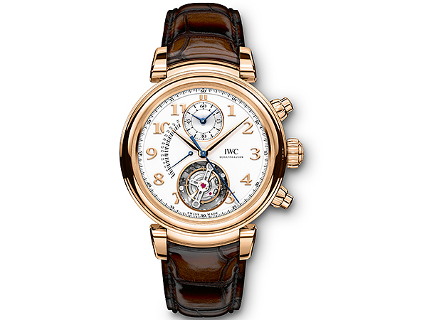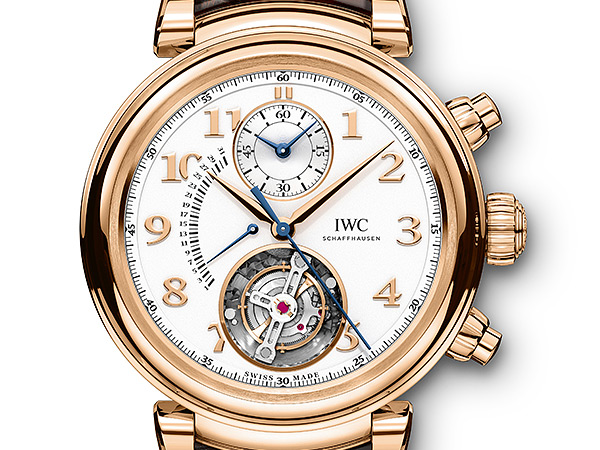 18K紅金款達文西陀飛輪逆跳計時腕錶(型號:IW393101)的飛行陀飛輪令整款腕錶脫穎而出,讓人過目不忘。複雜功能陀飛輪的框架被移至腕錶下方,由此省略了上方橋板。此外,這款時計還搭載極富高科技內涵的陀飛輪掣停功能,借此可對腕錶進行精確至秒的設定。