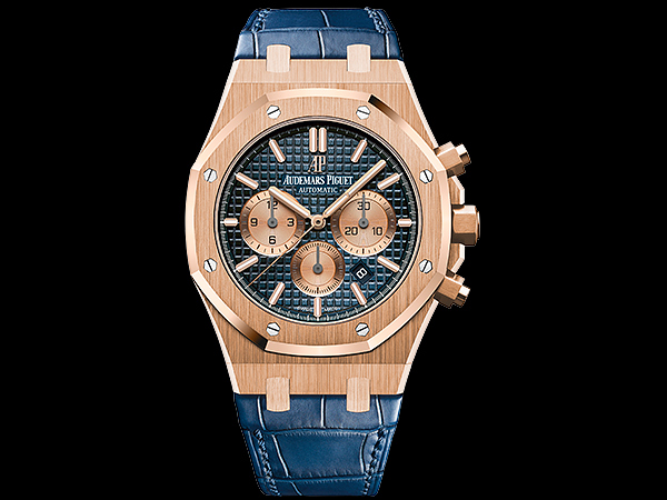 面盤:藍色面盤,鐫刻「Grande Tapisserie」大型格紋,搭配玫瑰金色計時器、螢光玫瑰金立體時標,皇家橡樹指針