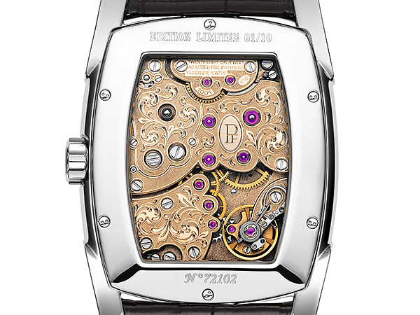 腕錶背面揭示了玫瑰金機芯精細優美的機構。底板、夾板和齒輪均在帕瑪強尼的製錶廠內製成,且飾有高級鐘錶工藝特有的精巧裝飾。