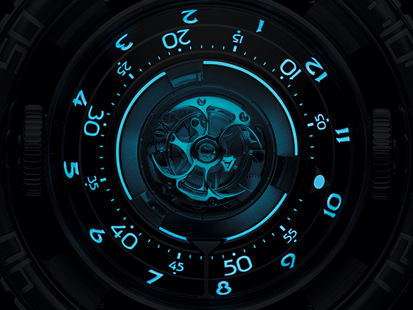 此外,HM7 就像水母般,能在黑暗中綻放光芒。如使用者所願,HM7可於小時與分鐘時標處發光,包含機芯內部周圍,使飛行陀飛輪在夜晚熠熠生輝,沿著觸手般的自動盤發亮,因此即使身處黑暗環境下,也能欣賞腕錶的運作。