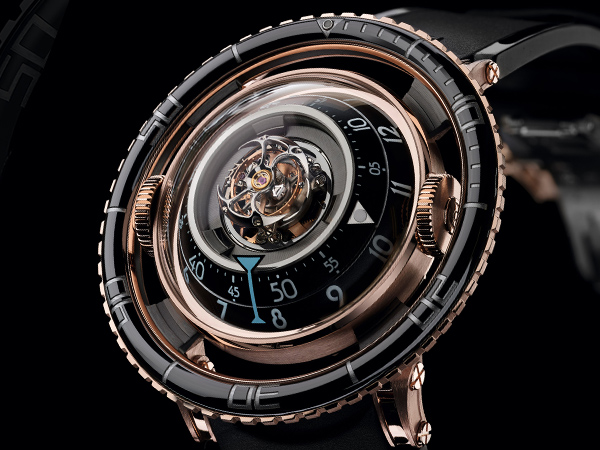 HM7 Aquapod 腕錶分別推出五級鈦金屬材質搭配藍色錶圈,限量33只;18K玫瑰金搭配黑色錶圈,限量66只。