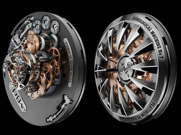 HM7的機芯由MB&F自製研發,共以303枚零件組成,具備72小時動力儲存。從底部的自動盤,到發條盒與小時及分鐘顯示,延伸至頂部的飛行陀飛輪,所有機制皆以同心方式繞著中央旋轉,打造出球形立體外觀。高圓頂的藍寶石水晶弧線以時間顯示環的造型映襯,以精密計算的方式呈現出曲面的球狀造型,取代角度分明的平坦表面。