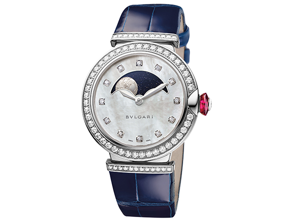 LVCEA新款月相腕錶巧妙精湛的以鱷魚皮帶與錶盤的月空相映成趣,根據不同的作品,可以搭配藍色亮面、紅色亮面或紫色亮面的鱷魚皮錶帶。寶格麗也推出三種魅力四射的款式,包括珍珠母貝面盤綴以明亮式切割鑽石的時標;錶圈與錶耳鑲嵌明亮式切割鑽石;與錶耳同樣鑲以明亮式切割鑽石、更加優美動人的18K白金錶殼版本。