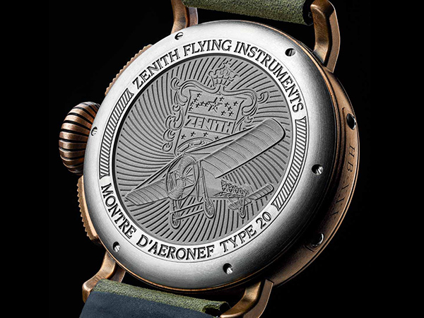 錶鏡:藍寶石水晶鏡面,鈦金屬錶背,鐫刻ZENITH飛行儀器圖案