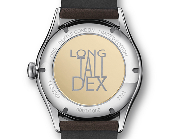 Oris的設計包含了一些微妙的細節,以連結此偉大的人物。12點鐘的刻度形狀像一個薩克斯風簧片,而在錶盤周圍拼寫“DEXTER GORDON”,每個刻度一個字母。中央黃銅色秒針是如同薩克斯風管,有一個擴展的平衡感,Dexter的暱稱“Long Tall Dex”,也刻在手錶的錶背上。