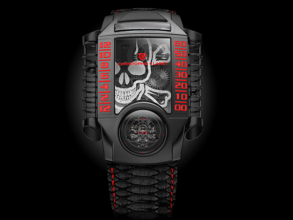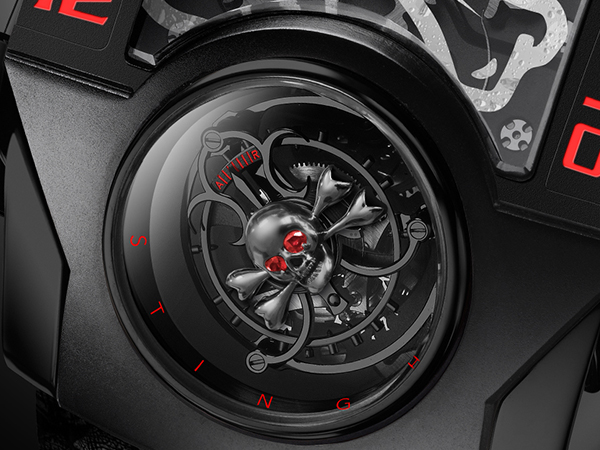 Christophe Claret不斷挑戰科技極限,有系統地探索全新美學表現方式。全新型號最令人著迷及驚歎之處是特大傾斜浮動式陀飛輪。陀飛輪位於6時位置,飾有由StingHD設計的黑色鍍鉻鋁金屬骷髏圖案。要在陀飛輪上骷髏圖案的眼窩鑲嵌紅寶石,就不得不設計一個全新的陀飛輪框架,為此品牌特別於X-TREM-1–StingHD採用特大錶殼以加強效果。
