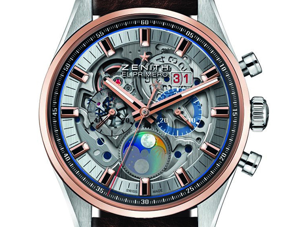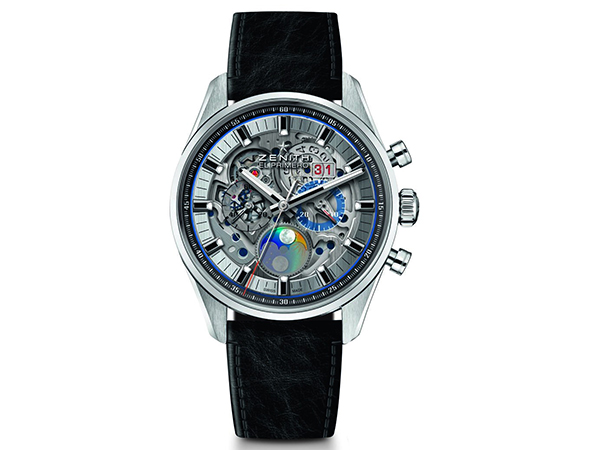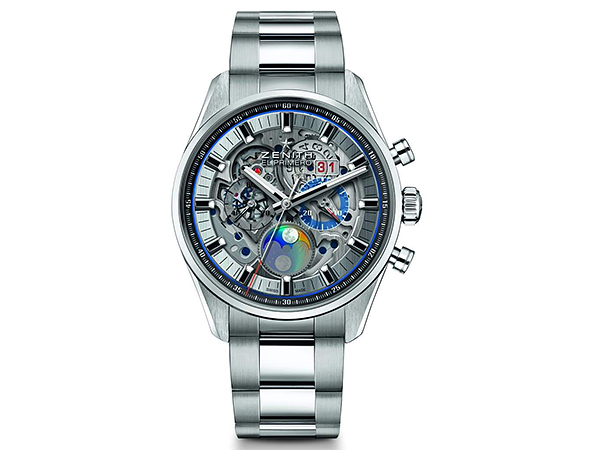 複雜的技術特色令人一眼著迷,堅固的不鏽鋼計時腕錶捉住視覺的焦點,並引導至真力時最先進的機芯深處。澄澈的藍寶石水晶錶面汲取1969年原型錶款的經典美學,具有兩個藍色及淺灰色透明計時盤,6時位置設有月相和日相的雙顯示盤。