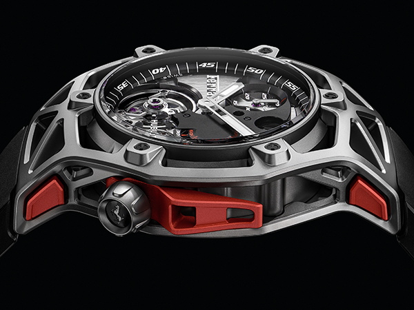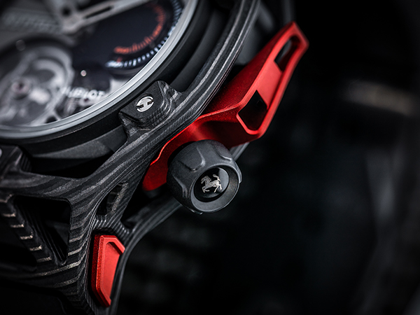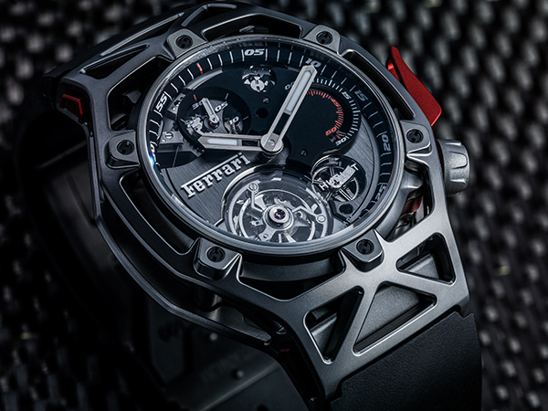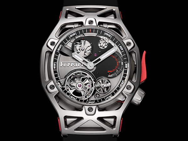 HUBLOT專業製錶廠將如此出色的設計、結合法拉利的研究成果、及其在引擎專業領域的應用、材質創新與專業製錶技術,全部融於一爐而治之,將美學與技術上的概念具體化為現實。結果是具有三件式模組化結構的外殼—鏤空的中間層、上層錶蓋與後底蓋——完全忠於法拉利的超跑風格。