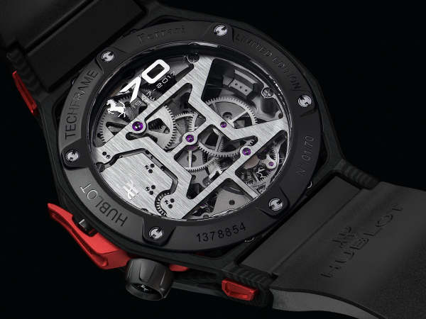 法拉利的標誌醒目置於9點鐘位置,而HUBLOT標誌則置於5點鐘。藍寶石面盤之下清晰揭露出運用最新科技的複雜機械裝置。藍寶石上由法拉利特別設計的一片霧面黑色區塊,在3點鐘位置承載著兩個以賽車為靈感的半秒計時盤,累計分鐘盤置於11點位置,而讓計時模組能夠行雲流水地啟動的核心—導柱輪與垂直離合系統,則置於1點鐘位置。科技感十足的可互換式黑色橡膠錶帶,搭配折疊錶扣,佩戴上更加輕鬆服貼。拆疊扣上蓋以PVD鈦金屬所打造,其上並飾有與錶殼材質互相呼應的皇金、聚醚醚酮複合樹脂碳纖維、鈦金屬的蓋板,蓋板上飾有Hublot品牌標誌。
