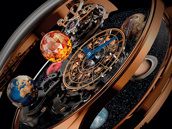 專為這款腕錶設計的JCAM19手動上鍊機芯,儘管尺寸更小、功能更多,但轉速卻比Astronomia系列之前的機芯更快。地球每10分鐘完成360度順時針的公轉週期,期間砂金石底板則以相同速度朝反方向轉動,交織出一幅加速運行的太陽系實況圖,它們宛如擺脫了地心引力,其運作情景令人目眩神迷。