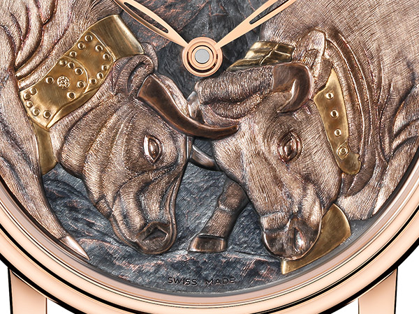 赤銅是一種主要由銅和金兩種材質構成的合金。在歷史上,赤銅一直被用於裝飾如刀鞘、裝飾品和珠寶等器物。熟練掌握赤銅技術的工匠,往往會在其作品上進行雕刻創作,並添加其他裝飾工藝。新款腕錶面盤上的「雙牛爭王」圖案先採用紅金材質打造,再通過微型支腳固定在赤銅工藝面盤上。