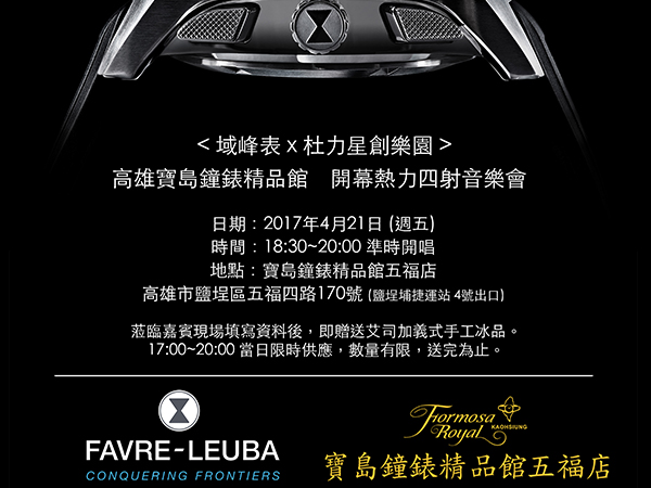 2017年二月初在台上市的FAVRE-LEUBA域峰表,將正式進入南台灣。搭配高雄寶島鐘錶精品館五福店開幕慶,合作成立店中店,將在4月21日剪綵後,特別安排18:00至20:00舉辦開幕慶音樂會。本次開幕活動,不只是域峰表的店中店開幕,更是高雄寶島鐘錶精品館五福店全新裝潢,盛大開幕的大日子。