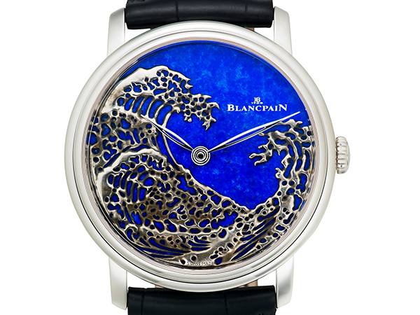 同場加映藝術大師-巨浪隱藏版腕錶,錶盤以青金石搭配白K金材質,完美將神奈川巨浪打造出「靜中見動」的視覺美感,與色調變幻的神秘錶盤互相輝映。在BLANCPAIN「金屬雕刻」大師的神技處理下,海浪湧動的力量感和動感美與錶盤上銀曜石/青金石代表的純淨和諧形成了鮮明的對比。
