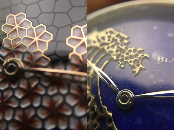 先以金質錶盤為基底,純手工鏨刻出花瓣及其他區域的弧形凹槽為金胎胎底,使花瓣區域的金質廓線立體呈現,再以白色內填琺瑯工藝,進行800度烈焰燒製。成形後採用微繪琺瑯工藝進行色彩創作,再次浴火燒製。成品需一次成形,實為鳳毛麟角。錶盤其他區域用黑色瑪瑙鑲嵌,以微米為單位鐳射切割,精細至極。凹陷的琺瑯櫻花與凸出的金質輪廓,營造出極強的立體觀感。