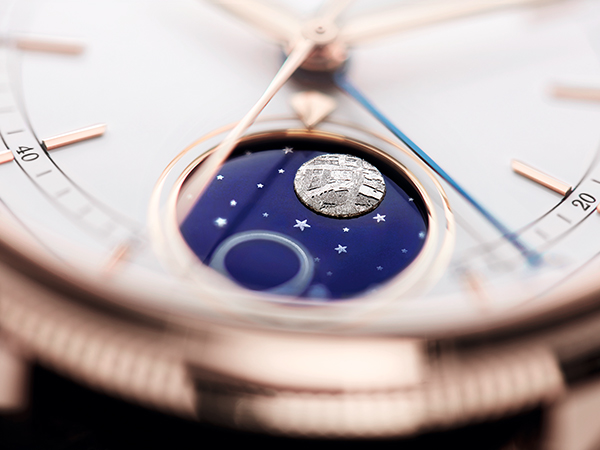 新款Cellini Moonphase 配有白色漆面錶面,錶面上有一藍色琺瑯月相盤,位於6 點鐘位置,顯示滿月和新月。滿月以圓形隕石象徵,新月則以銀環代表。根據月亮朔望盈虧週期,月相便在月相盤12 點位置的標記下顯示。
