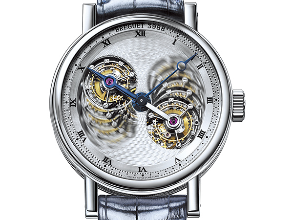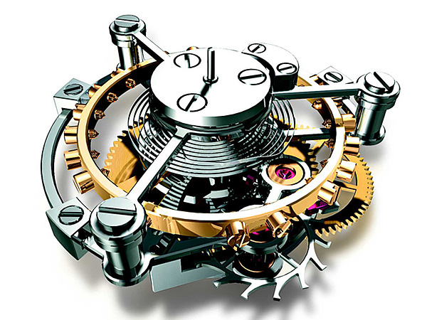 其兩具獨立運作的陀飛輪裝置各自擁有專屬傳動系統,座落於旋轉中心面盤上相互遙望,獨特的結構將兩具陀飛輪的均速連結至中央旋轉面盤及時間顯示機制,因此腕錶的速率即為兩具陀飛輪的均速,使其機芯較一般機芯更精準兩倍。連結兩具陀飛輪的橫桿標示小時,面盤隨之每12小時旋轉一圈,與陀飛輪雙雙旋轉舞出宇宙奧妙的旋律,完美展現天體邏輯體系,令人為之驚嘆。