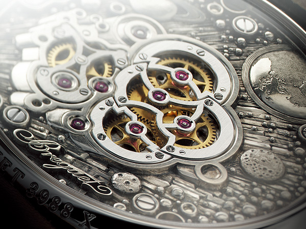 錶背以巧奪天工的鐫刻立體浮雕,呈現九大行星運行的銘刻設計,呈現出有如天體運行般的軌道,與自轉公轉的雙旋轉陀飛輪相互呼應,翩然秀出太陽系運行概念,充分傳達寶璣大師製錶的精神,絕對是美學與工藝技術共譜的精心傑作。