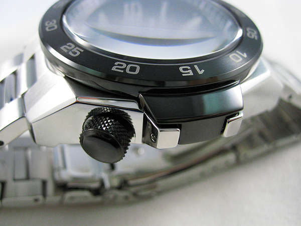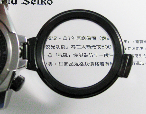 有鑑於錶殼上層錶圈使用了放大鏡設計,因此錶殼的整體厚度也增加到17.2mm,加上43mm的錶徑,也算是大尺寸的錶款。但是拿在手上時並不會感覺過於沉重,可能增加厚度的地方僅限於錶圈部分,因此整體重量仍控制在一定的範圍之間。而打開放大鏡錶圈的按鈕位於錶殼八點鐘位置,因此錶殼三點鐘位置的結構,就是放大鏡錶圈與錶殼之間的轉動軸承;由於剛好位於錶冠的上方,堅固的結構反而成為另類的錶冠護肩,可確保錶冠的安全。而錶款的錶圈與錶冠都採用黑色IP電鍍處理,這是近年來精工常用的設計;與一般的電鍍處理相比,精工的電鍍零件,表面反而比較像是車輛烤漆,呈現出又厚又亮的表面光澤,算是比較少見的設計。