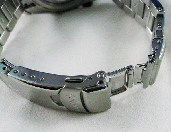 雖然本款腕錶屬於Prospex專業運動錶系列,但是錶冠結構採用壓入式設計,而非潛水錶所具備的旋入式設計,因此本款腕錶的防水性能是100米。以防水等級來說,可以進行簡單的水上活動,但是不能進階到專業的潛水活動。而本款腕錶的錶扣,採用按壓式摺疊錶扣設計,外層還有安全錶扣設計,是許多運動錶所具備的設計,可增加錶帶的安全性,不會產生腕錶脫落的情況。至於錶扣前方的延長錶帶設計,主要是針對穿著潛水裝時,需要較長的錶帶來配戴,使用者可打開此一裝置,就能延長錶帶的長度。不過,就筆者個人的經驗來說,沒有旋入式錶冠的設計,最好還是不要游泳或是浮潛;因為隨著時間的流逝,錶冠內的膠圈會老化,無法保證水性能與剛出廠一樣。除非腕錶仍處於新錶狀態,或是經過錶店的檢驗合格,否則不要將防水的性能使用到極限,小心的對待愛錶,比較不會傷自己的荷包。