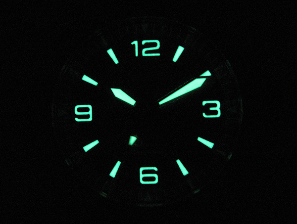 本錶款的指針與時標,全部都填滿夜光塗料,因此在吸收光線之後,效果自然是非常的優異。精工所採用的夜光塗料,在網友之間的評價算是非常的高,許多瑞士錶所使用的夜光塗料,亮度往往不及精工所使用的夜光塗料。筆者在當兵時所使用的精工五號,在晚間十點關燈之後,到清晨的四、五點,仍可看見其發光的效果。因此本款腕錶的大面積螢光指針,與3、6、9、12的夜光時標設計,相信在任何的環境中,都可維持良好的效果。