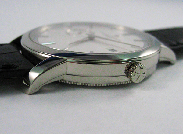 而本款腕錶之所以吸引筆者的地方在於,它使用堅固的旋入式底蓋,以及新款的Cal.2455自動機芯。因為大部分的高級錶廠在製作這類型的貴金屬腕錶時,錶殼的成本會佔據相當高的一部分;尤其現在黃金的價格早已突破每盎司1500美元,因此每一年推出的貴金屬錶款,價格都持續攀升。除了原物料的成本需要計算之外,製作錶殼所需要耗費的資源,以及人工成本,也是直逼貴金屬的價格;因此越堅固,防水性能越好的貴金屬錶殼,錶殼的整體成本也會提高。而本款腕錶使用同類型錶款中,不常見的旋入式底蓋設計,對於防水性能與耐久度方面,絕對有相當大的幫助。許多三十、四十年前的K金錶款,由於僅使用壓入式底蓋設計,經過數次的底蓋開啟之後,防水的性能幾乎已經喪失了;因此旋入是底蓋設計,在這一方面的確是佔有相當大的優勢。而本款腕錶雖然屬於輕薄型的錶款,但是錶殼與錶耳結構來看,卻又有另外一種紮實堅固的感覺,這也是紳士型腕錶中少見的設計。