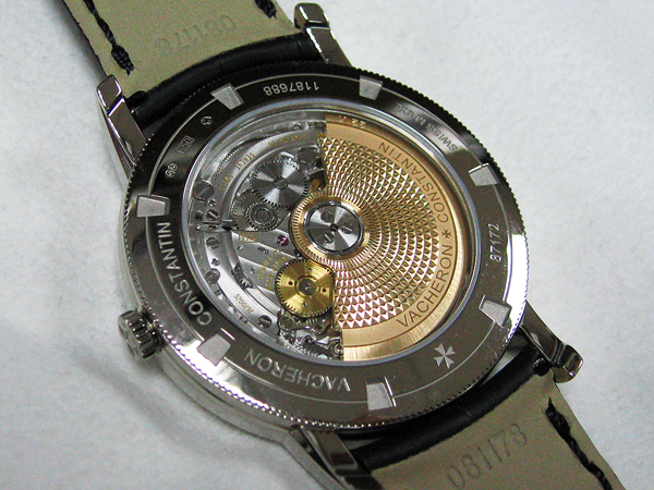 在過去的一段時間,江詩丹頓一直都沒有於屬於自己的自製自動機芯,或許是基於生產規模的考量,所以遲遲沒推出自己的自動機芯。但是在2005年,江詩丹頓為了慶祝建廠250週年,推出1755限量腕錶,內部所採用的Cal.2475自動上鍊機芯,就是廠方製造的自動機芯。但是Cal.2475還具有動力儲存與星期功能,所以移除了上層模組,就成為一枚基礎的自動機芯;而本款腕錶所使用的Cal.2455機芯,則是小三針款式。Cal.2455機芯的直徑為25.60mm,厚度是3.60mm,震頻為每小時28,800次,與目前業界多功能的ETA 2892-A2自動機芯完全相同,因此相當適合加裝其餘的各項功能模組,所以筆者非常看好此枚機芯的未來發展。本枚機芯採用22K玫瑰金做為自動盤材質,上方並鐫刻華麗的飾紋,而自動盤軸承採用免潤滑的陶瓷滾珠,提高運轉的耐久性;而位於左側的金黃色自動齒輪,與自動盤軸承相連,同時連接其他的上鍊輪系。Cal.2455機芯具單向自動上鍊功能,自動盤在逆時針轉動時為空轉,而順時針轉動時,才會替發條盒上鍊。