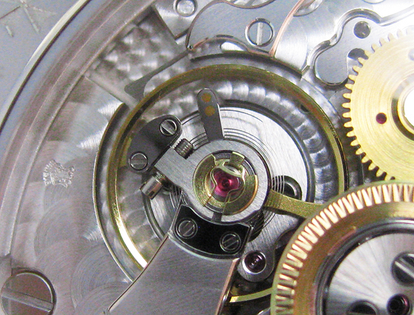 目前江詩丹頓通過日內瓦印記的產品比例,已經逐步的提高,這也是受惠於先前江詩丹頓所推出的Cal.1400手動上鍊機芯;所以後來推出的Cal.2400系列自動機芯,自然也具備日內瓦印記。然而本枚機芯的日內瓦印記,想必很多人一開始都遍尋不著。因為有別於一般的日內瓦印記,鐫刻完老鷹與鑰匙的圖樣後,會塗上一層金漆;但是本枚機芯沒有使用此一步驟,所以印記完全的融入於機板之中,需要仔細的尋找,才能看見印記位於何處。而本枚機芯的印記,位於擺輪旁邊,已經快要到了機芯的邊緣,的確需要花費一番精力才能找到。另外本系列機芯最大的特色,就是位於擺輪旁的停秒裝置。一般來說,停秒裝置都採用簡陋的簧片來製造,當使用者拉開錶冠時,簧片會緊靠擺輪邊緣,迫使擺停止運動。但是本枚機芯通過日內瓦印記,所以即使連一根小簧片,也需要由整塊金屬來切削,並加以打磨處理;所以從這幾個細小的停秒零件來看,我們可以了解廠方的用心之處。