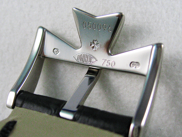 江詩丹頓的錶扣都是以著名的馬爾他十字商標為設計概念,因此別具特色。本次筆者特別注意到,錶扣的背面有烙印上多種K金印記,也是消費者比較注意到的地方,所以特地拍下照片與網友分享。在錶扣最左邊的小圖案,是聖伯納犬狗頭的印記,這是瑞士在1995年之後,使用於貴金屬上的印記。至於要看貴金屬的成分,就需觀看右側天秤標記旁的數字,通常標示750就代表是18K金材質。另外,錶扣上還鐫刻馬爾他十字以及UNROC的字樣,可充分彰顯出這款錶扣的純正血統與材質品質。