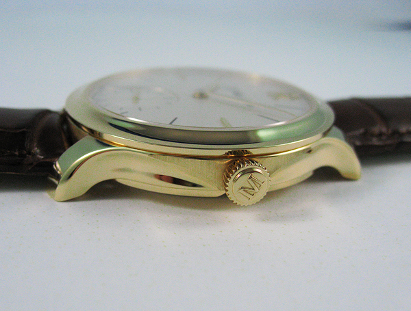 創立於1826年的H. MOSER & CIE算是一家歷史悠久的錶廠,其創辦人Heinrich Moser在1805年出生於瑞士北方的Schaffhausen夏夫豪森,這是屬於瑞士的徳語區,因此H. MOSER & CIE所生產的錶款,具有濃厚的徳式風格。到了2002年,Moser家族的後代與其他合資者,重新成立H. MOSER & CIE錶廠,並於2005年推出首款腕錶。從錶殼的曲線造型來看,我們可以發現錶款本身具有徳式風格,不僅錶殼結構紮實,側面線條採用類似海鷗展翅的特殊設計,錶殼的中央更採用磨砂拉絲處理,強化整體的視覺效果。而錶圈與錶耳同樣採用亮面拋光,內凹式的錶圈線條,讓錶款從正面來觀看時,具備圓潤柔和的特性。另外,錶冠的設計雖然有有任何的特別之處,但是刻痕極深的表面紋路,讓使用者在操作時,具有卓越的防滑特性,而每一次的上鍊動作,都能確實且又有效率。