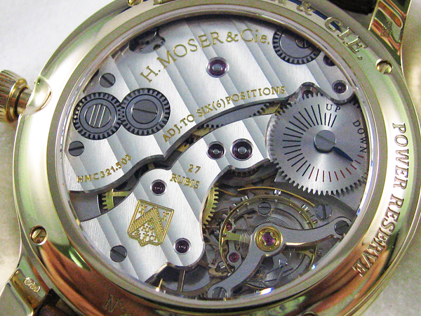 H. MOSER & CIE所生產的錶款,其最大的賣點自然就是機芯的部分。其實放眼整個瑞士製錶業,大部分的手動上鍊機芯,都是偏向輕薄的設計居多;而大尺寸的機芯,其實都是以昔日的懷錶機芯來改裝,尺寸其實略為偏大。而Mayu所採用的Cal. HMC 321.503手動上鏈機芯,其直徑為34mm,而厚度為4.8mm,整體規格相當式中,剛好介於兩種類型機芯的中間。由外觀來看,感覺Cal. HMC 321.503是一枚非常堅固的機芯,厚實的機芯夾板與雙臂擺輪錶橋,賦予本枚機芯高度的信賴感。而夾板表面採用特殊的雙波紋設計,其視覺美感不遜於傳統的日內瓦波紋;不過廠方使用高級的電鍍處理,讓筆者在拍攝的過程中,幾乎每一個角度都能拍攝出亮麗的畫面,其實是勝過許多高級錶廠的產品。而本枚機芯採用單一發條盒結構,但卻可提供超過72小時的動能,主要是在發條盒與二番車之間,加裝一個轉換齒輪;另外機芯採用每小時18,000次的震頻設計,所以可延長發條盒的動力。
