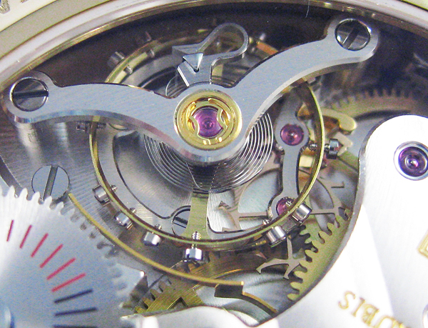 而本枚機芯的另一項最大賣點,就是整組擒縱裝置(包含擺輪、游絲、馬仔以及擒縱輪)可獨立拆卸,同時基板下方會有一個零件會鎖住四番車,避免發條強大的動力在拆卸的過程中,被快速旋轉的走時輪系打壞擒縱輪與馬仔,這與以往需要先釋放發條盒能量的設計不同,所以可看出廠方在設計方面的用心。另外機芯內採用特殊硬化的K金材質製作馬仔與擒縱輪,除了具有抗磁、防止生鏽等特性之外,最重要的地方就是具有話題性,並可提高錶款本身的價值。而擺輪結構也採用傳統的螺絲擺輪設計,擺輪支臂兩側的微調螺絲,表面具有十字形凹槽,可讓製錶師準確的調整時間快慢,另外其他都屬於補重螺絲。而高級錶款才會使的雙層游絲設計,本款腕錶自然不會缺少,清晰的彎曲線條,越過整個游絲上方,直達游絲頭的固定樁。此外擺輪旁邊的圓盤動力儲存顯示,在發條增加能量時,只有圓盤會轉動,指針不會動,也是比較罕見的設計;而兩者之間的黃色銅片,則是停秒裝置。