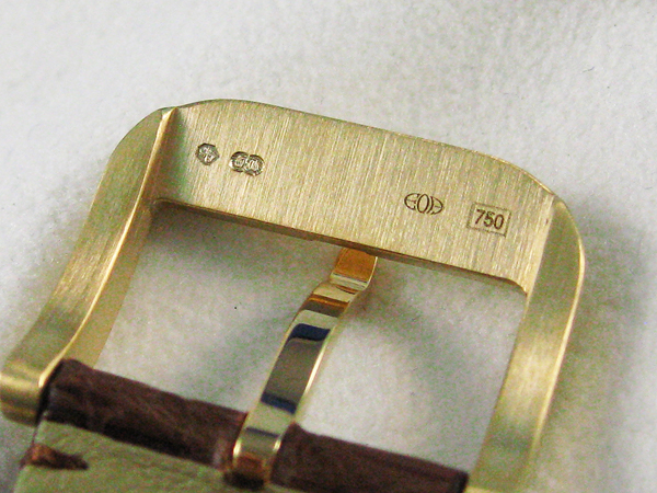 這次筆者也有特地拍攝Mayu的錶扣,其結構相當紮實,用料毫不含糊,整體造型也比較圓弧,但是採用了直紋拉絲的處理,質感十分優越。而錶扣的背面有烙印上多種K金印記,在錶扣最左邊的小圖案,是聖伯納犬狗頭的印記,這是瑞士在1995年之後,使用於貴金屬上的印記。至於要看貴金屬的成分,就需觀看右側天秤標記旁的數字,通常標示750就代表是18K金材質。