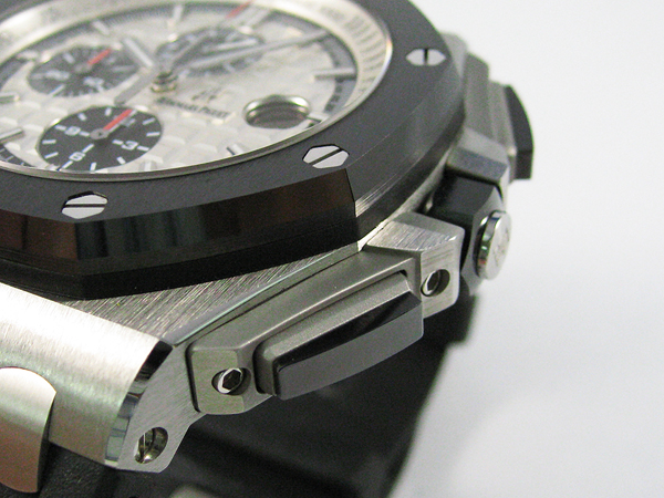 雖然原本皇家橡樹離岸型計時碼錶所採用的42mm錶徑,已經不算小,但是隨著大錶風潮的盛行,以及大尺寸的限量款熱賣;因此,愛彼錶廠也將錶殼尺寸擴大為44mm,讓錶款的整體風格更為氣派大方。而熟悉皇家橡樹離岸系列的讀者們都知道,愛彼在1993年推出本系列錶款,其具有 100米的防水性能,以及多樣化造型設計與色彩配置,運用於錶圈、計時按錶與錶冠表面的橡膠材質,在當時也是非常創新的材質。但是隨著科技日新月異,具有防刮、質地堅硬的高科技陶瓷,也逐漸運用於皇家橡樹離岸系列之中;原本僅使用於特殊款式的陶瓷材質,在新款的計時碼錶上,已全面列為標準規格,不論是貴金屬或是鍛造碳的錶殼上都可以看見。而陶瓷錶圈的表面,以直紋霧面拋光處理,展現出與錶殼相同的光澤,但是在錶圈側面,廠方以亮面拋光處理,呈現陶瓷材質應有的原貌,透過這樣的設計,頓時讓錶款的質感提升許多。另外最後一項的改變,就是全新的計時按把結構;以往基本款的皇家橡樹離岸計時碼錶,皆採用圓形計時按把,這也是愛彼最常用的設計。不過就錶款的外型來看,長方形的計時按把更能襯托出錶款剛毅豪邁的本質。因此,愛彼採用新式的長方形計時按把,表面嵌入陶瓷材質,而原先與錶殼一體成形的計時按把護橋,則使用分離式設計,並以四顆螺絲固定於錶殼之上,透過不同的打磨處理,呈現出更為陽剛的錶款風貌。而筆者實際操作按把之後,發現所花費力量更小,觸感也更加柔順,這大概就是長形計時按把的優勢所在。