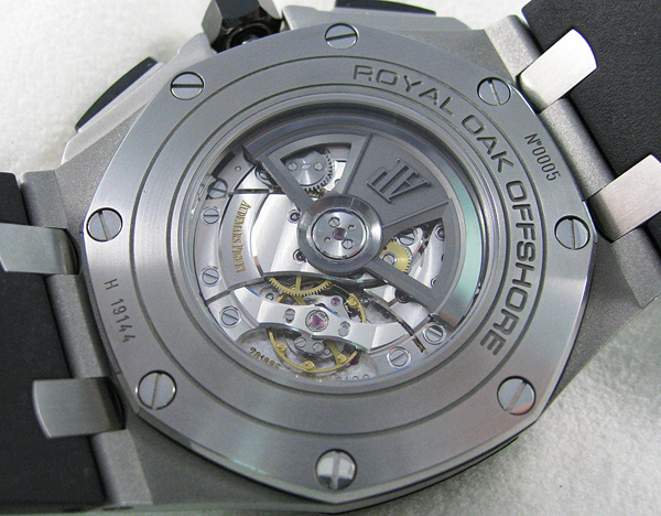 新款的皇家橡樹離岸型計時碼錶,全面採用藍寶石水晶透明底蓋的結構,這種設計在先前的皇家橡樹離岸型系列當中比較少見,除非是特殊限量款才有搭配此種設計;主要的因素可能在於使用防磁軟鐵結構,以及使用非自製的計時機芯。如今,在錶廠全面改用自製的Cal.3126/3840自動計時機芯之後,為了展現這枚頂級的自動機芯,因此採用透明底蓋,自然也是迎合消費者的喜好。我們從底蓋來觀看,可以發現底蓋與錶圈同樣是以8顆螺絲固定,但是只有底蓋的螺絲是可以轉動。而錶殼內搭載的Cal.3126/3840機芯,則是愛彼最新款的自製計時機芯,為了提高錶廠的自製機芯比例,以及取代非自製的Cal.2326/2840自動計時機芯,因此愛彼以Cal.3120自動機芯,結合上層的計時模組結構,成為Cal.3126/3840自動計時機芯,所以機芯具有與Cal.3120相同的優點。本枚機芯加裝計時模組之後,直徑增加至29.92mm,厚度為7.16mm,使用59顆紅寶石軸承,每小時振頻為21,600,具有60小時的動力儲存。而機芯的外觀與Cal.3120自動機芯略有不同,主要是使用無煙煤色電鍍處理的自動盤,以及兩側鏤空的設計,但是內部仍是使用22K的黃金材質,保有良好的上鍊效率。