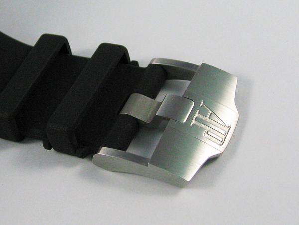由於皇家橡樹系列的錶殼結構,線條比較銳利,以東方人較小的手腕來配戴,不見得每個人會覺得非常適合。因此,本次新款的皇家橡樹離岸型計時碼錶,首先推出的款式都是搭配黑色橡膠錶帶。由於其柔軟的材質,能服貼於手腕之上,即使身材沒有特別高大,也能配戴這款44mm的新款皇家橡樹離岸型計時碼錶,而且視覺效果也十分出眾。而錶帶的錶扣則使用不鏽鋼材質製作的標準型針扣,為了符合皇家橡樹離岸型系列的風格,針扣的結構自然非常堅固厚實,表面以霧面拉絲處理,與錶殼的打磨修飾完全相同。