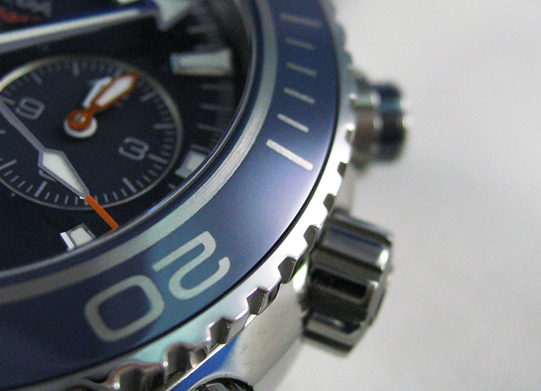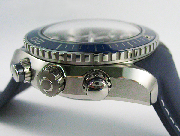 由於大部分的潛水錶,為了兼顧錶殼的防水性能,比較少採用透明底蓋設計;不過隨著現代的科技進步,以及銷售方面的考量,部分潛水錶款也紛紛採用透明底蓋,所以錶殼的厚度會更明顯。而Seamaster Planet Ocean具備防水600米的性能,因此原本錶殼就比較厚,一般的自動大三針錶款,其厚度就已經達14.2mm,而本只計時錶款,厚度更超過19mm,算是一個重量級的錶款。不過筆者拿到此錶款,發現重量並不重,覺得非常驚訝,直到看見新聞稿的資料,才發現原來錶殼是使用五級鈦金屬材質,因此自然輕盈許多。透過錶殼側面的圖片,我們可以發覺錶殼仍延續Seamaster 海馬系列的錶殼曲線,但是中間的錶殼非常厚,藍寶石水晶鏡面也較許多潛水錶還要厚,因此配戴在手上非常顯眼。不過當筆者試著旋開計時按把,才發現本錶款的按把不是採用旋入式,而是可以直接操作的設計,這是在Seamaster系列中少見的設計。不過操作計時按把時,發現按把左右晃動的空隙非常小,所以可能是使用了新式結構,所以廠方才捨棄原有的旋入式設計。