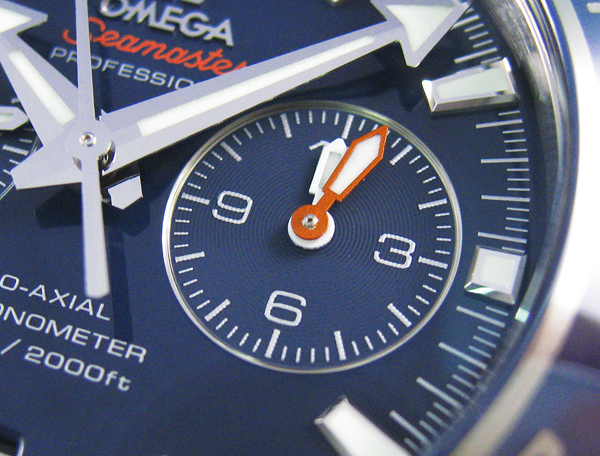 另外本錶款與先前OMEGA的Cal.3300系列機芯最大的不同在於,使用特殊的同軸計分與計時盤。因為以往的計時碼錶,幾乎都採用分離式的計時錶盤,主要的原因就是結構比較簡單;但是30分鐘的計分盤,閱讀的效果的確比較差,使用者還要換算一下累積的數字,因此已經有部分錶廠改用60分鐘計時盤,結合與計時盤同軸的設計,觀看計時結果變得方便許多。而Cal.9300自動機芯,也使用相同的結構,位於3點鐘位置的同軸計時盤,上方的橘色指針是60分鐘計時指針,而下方的白色指針則是12小時計時指針;位於九點鐘位置的是走時小秒針,可透過錶冠拉出第二段的停秒功能,來精確的調整時間。