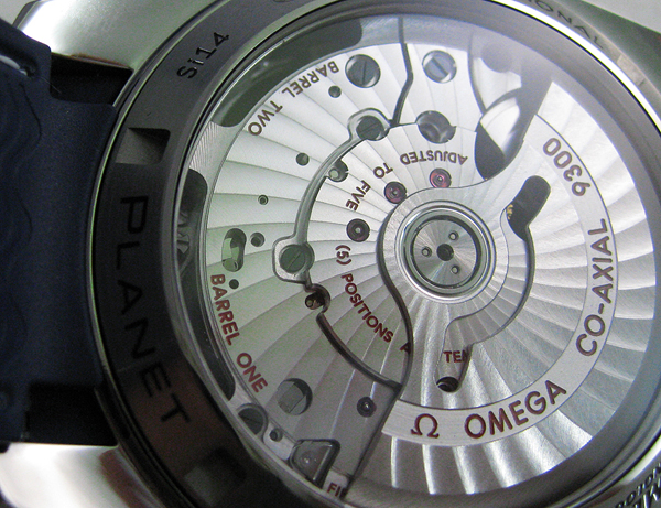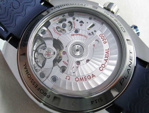 目前OMEGA所採用的計時機芯,種類相當多樣化,除了ETA 7750與ETA 2892附加計時模組之外,比較高階的Cal.1861手上鍊計時機芯與Cal.3300自動計時機芯也是廠方的主力計時機芯。雖然後兩者屬於OMEGA的專用計時機芯,但是以比較嚴格的標準來看,仍然不能完全算是自製的計時機芯。因此,在2011年推出的Cal.9300系列自動計時機芯,在結構設計以及整體風格來說,的確表現出廠方人員的設計巧思以及品牌特色。本款腕錶雖然是防水600米的錶款,但是為了展現這枚最新推出的Cal.9300自動計時機芯,所以也特別採用透明底蓋設計;Cal.9300的機芯直徑為32.5mm,厚度是7.7mm,具有54顆紅寶石軸承,算是尺寸比較大的計時機芯。從外觀來看,Cal.9300採用與Cal.8500、Cal.8520(女用款)相同的機芯表面處理,以特殊的阿拉伯式日內瓦波紋裝飾整個機芯夾板與自動盤,此外還使用少見的紅色字樣,以及黑色的螺絲與擺輪設計,成為OMEGA新一代的自製機芯的標準規格。透過底蓋,我們可以看見大尺寸的擺輪,以及旁邊的導柱輪裝置,而本款機芯也運用垂直離合結構,與導柱輪搭配。