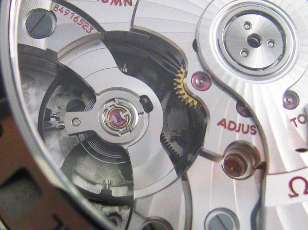 而目前OMEGA最引以為傲的技術就是——同軸擒縱裝置,這項技術自1999年正式推出以來,至今已經超過十個年頭。而Cal.9300同樣也採用這項專利,但是其結構與當初最早推出的Cal.2500自動機芯已有所不同。由於Cal.2500當初是以Cal.1120機芯(源自於ETA-2892-A2)為基礎來修改,所以走時輪系的設計,仍必須受限於機芯的結構,因此在剛開始推出時,品質仍不算穩定。日後廠方修改了齒輪形狀,以及將震頻修改為特殊的每小時25, 200轉,整體的運作效能才更趨穩定。如今,新推出的Cal.9300自動計時機芯,延續Cal.8500的規格,擒縱輪採用新式的三層齒輪設計,並搭配大型的四臂螺絲微調擺輪與無卡度游絲設計,可以使運轉效率更為優異,同時易於調較快慢。另外本款機芯也採用最新的 Nivachoc避震器,位於寶石上方的避震簧片,由兩個T字型結構來頂住紅寶石,是目前Swatch集團的專用避震器。而Cal.9300也使用了矽材質(Si 14)游絲,透過圖片,我們可以清楚的看見色澤呈現淡紫藍色的矽游絲。這是繼Cal.8520系列女用自動機芯後,第二個全系列使用矽游絲的機芯,也讓OMEGA成為業界唯一大量使用矽游絲的錶廠,且價格仍在合理的範圍內。由於矽屬於非磁性材質,因此完全沒有受磁的可能性,加上使用精密的半導體技術來製造與切割游絲,所以游絲結構具備高精密度,同時免去人為的失誤,將游絲品質控制在最佳的水準狀態。