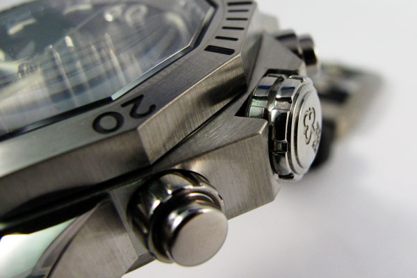 看來粗勇的錶冠護肩,其實主要的功用,只是在於增加錶款的硬漢質感。對於錶冠本身的保護,其實只有一點點而已。不過崑崙在計時按把的設計上倒是多了些防護措施。為了怕誤觸,一般在陸地上就算了,誤觸頂多開始計時,但若在水中啟動計時,那是會進水的!因此在計時碼錶上加裝鎖頭,要旋開之後才能操作。好!請記得,使用完畢記得鎖回去。不然誤觸導致進水,就是個人問題了。