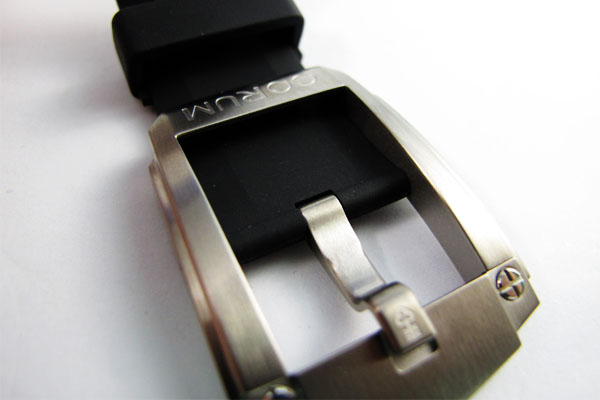 同樣感覺粗勇的錶扣,但,對此不免要稍微挑一下毛病的是,這樣的設計如果在水下運動,是否會有鬆開的可能性呢?而,如果真的因為各種巧合而鬆開,錶帶一翻兩瞪眼,應該一下子就會沈到海底吧?如過這部分做成蝴蝶錶扣是否會更安全些?