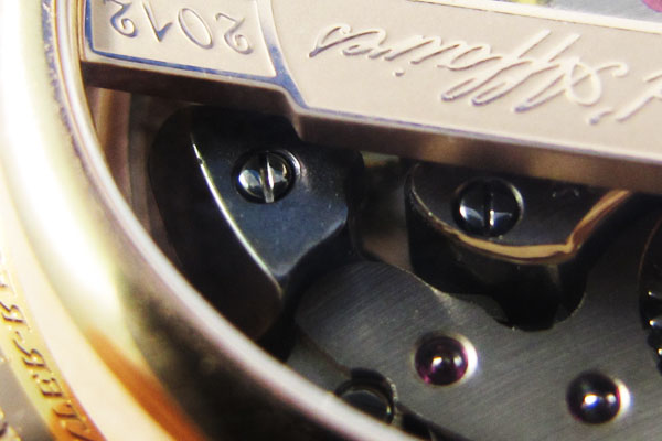 Charge d’ Affaires機芯用的是AS1475手上鍊機芯,雙發條盒,一發條盒供正常時間走時,另一發條盒則是提供鬧鈴的動力,上滿鍊後可以持續響鈴約12秒。兩點鐘位置的錶冠是操作鬧鈴功能,包括為鬧鈴機制上鍊以及設定指針。而四點鐘的錶冠,則就是時間的調教與上鍊。