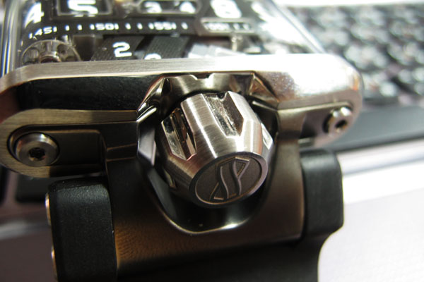 六點鐘位置的龍頭,不是拉的!而是用按的。按下之後數秒,本來運作中的腕錶會歸零到12點鐘位置,然後停止運作。再次按壓就會迅速跑回現在時間。