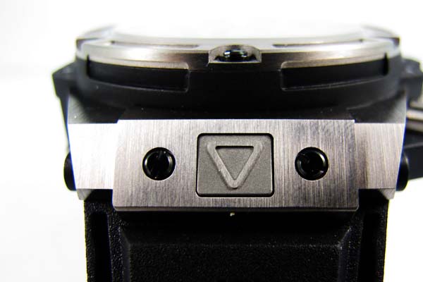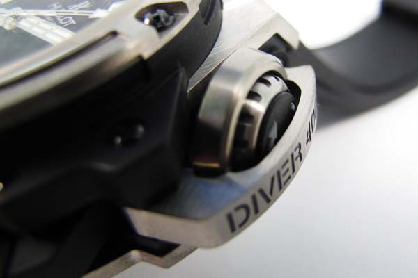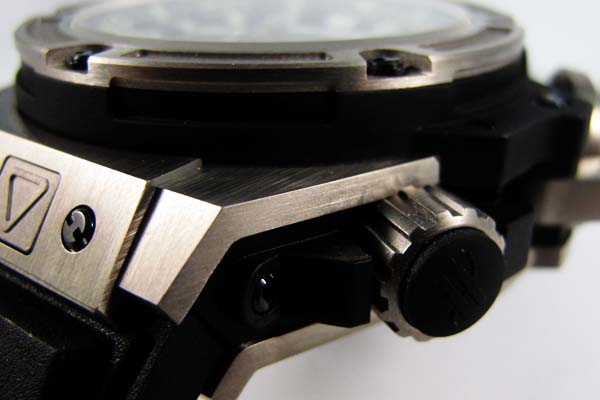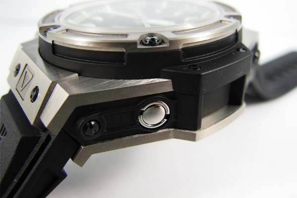 三明治似的錶殼結構是HUBLOT一直以來的設計特色,加強硬的二級鈦金屬,夾招牌的橡膠材質,除了造型相當帥之外,多層次的結構對防震抗壓都極有幫助,而這兩樣材質的結合,更是輕巧的讓人想轉圈圈!即便藍寶石水晶玻璃厚達6.5mm,錶款直徑也達到48mm的大尺寸,但實際在陸地上配戴時也不會覺得沈重(只是覺得大一點),而到了水中,也不會重到把潛水者拉到海底(冷)
