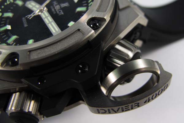 隨時隨地都有型有款,Oceanographic 4000最讓人印象深刻的部分絕對是兩點鐘位置的龍頭。這個龍頭控制的是旋轉內圈。旋轉錶圈的主要功能,是為了方便計算潛水者的氧氣筒內氧氣存量。這是直接攸關潛水者生死的機制。如果因為在水中運動時意外的碰撞,導致原先設定的時間跑掉。時間減少那也就算了,但如果時間不小心延長了?本來氧氣存量只剩五分鐘,結果設定跑掉,誤導還有十五分鐘。這,等發現的時候,應該就差不多要溺死了吧!由於事關生死,HUBLOT不只將旋轉錶圈移到內圈,雖然在調整上可能比較不方便(旋轉外圈只要直接轉錶圈即可完成設定,就算戴手套也能輕鬆完成,但旋轉內圈則否),但是安全第一。此外,HUBLOT加裝了大型的錶觀護蓋,以一個環狀的O型的環狀安全鎖扣保護旋轉內圈錶冠,以避免意外碰撞動到操作錶冠。